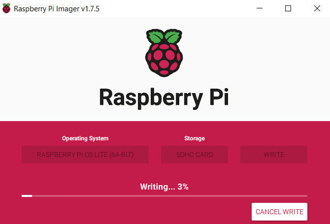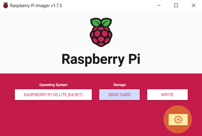 Click CHOOSE STORAGE button. On storage selection list, select Raspberry Pi OS Lite(64-bit)