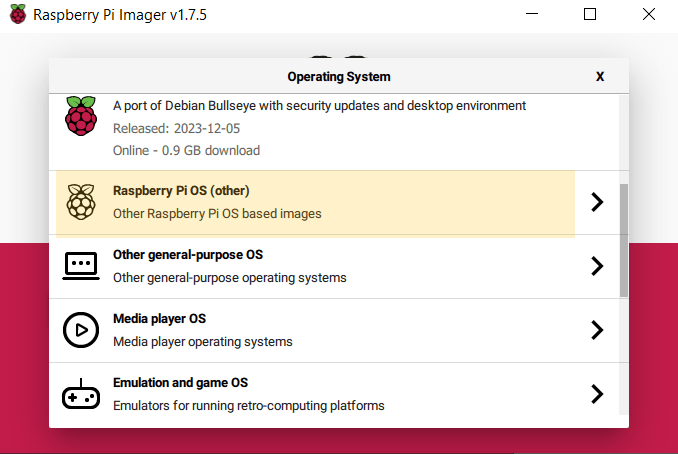 I am going to choose Debian Bookworm with out Desktop because i just want to run the light version without desktop GUI access. So, i scrolled a little bit down and select Raspberry Pi OS (other).