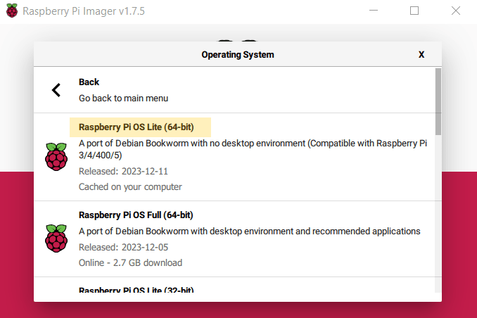 On the next option list, select Raspberry Pi OS Lite (64-bit).