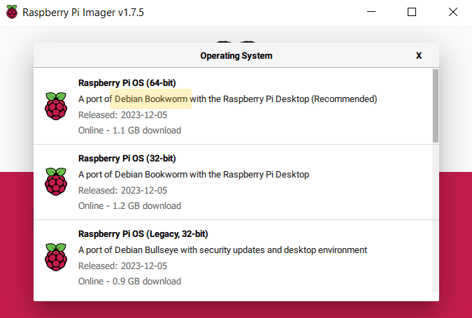 Click CHOOSE OS button. A drop down list will appear to give you a list of Raspberry PI OS you wish to install. It seems Debian Bookworm is the latest version at the time being.