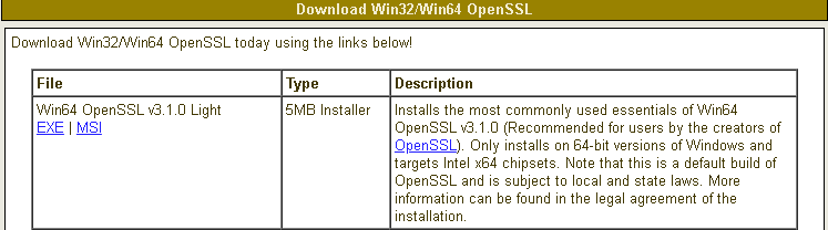 First thing first, you need to download openssl application installer from the following link : https://slproweb.com/products/Win32OpenSSL.html. Because my computer is running windows 10 pro 64 edition, so i am going to choose Win64 MSI version.