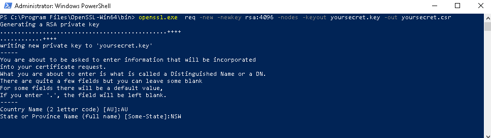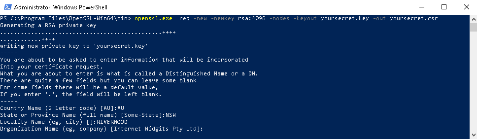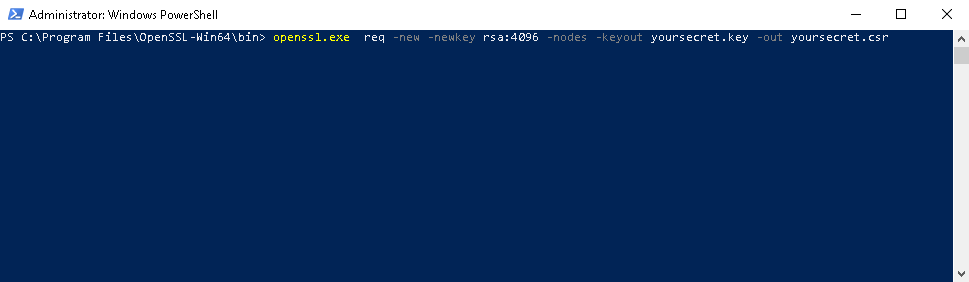 On the prompt type openssl.exe req -new -newkey rsa:4096 -nodes -keyout yoursecret.key -out yoursecret.csr.