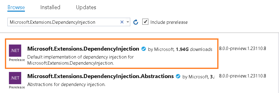 On Browse, search for Microsoft.Extensions.DependencyInjection. Select that one and click Enter.