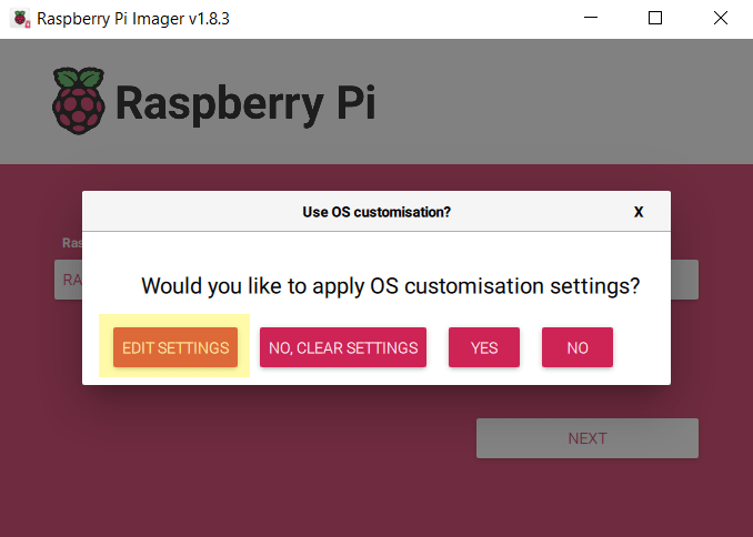 Because we are going to access our raspbian os via ssh, we need to setup the pi user as well as the WIFI credentials. Click EDIT SETTINGS then YES button.