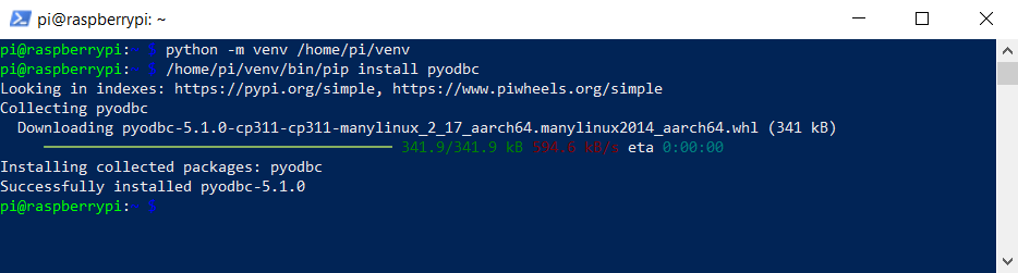 Login to your raspberry pi via ssh. On pi@raspberrrypi prompt, type : pip install pyodbc followed by ENTER. pyodbc is our first library we try to install in this scenario.