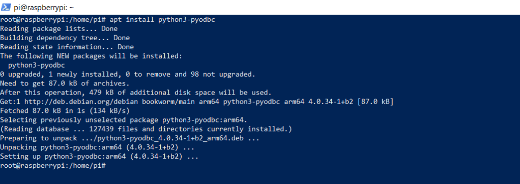 Back on pi@raspberrypi prompt type sudo su to switch to root user. On root@raspberrypi:/home/pi# prompt type apt install python3-pyodbc followed by ENTER.